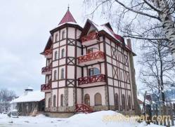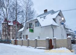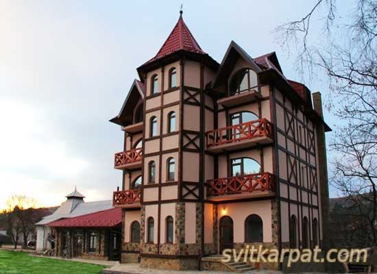 На великій облаштованій території розташовані чотириповерховий готель, двоповерховий котедж "Під каштаном", двоповерховий котедж "Медовий", двоповерховий котедж зі сауною "Мисливський", альтанка, мангал, гойдалка. ОРГАНІЗОВУЄМО ТИЖНЕВІ ТУРИ — ДЕТАЛЬНІШЕ ТУТ Готель на 14 номерів На першому поверсі — рецепція та ресторан. Стандарт — двоспальне або 2 односпальні ліжка, шафа для одягу, телевізор, стіл зі стільцями, санвузол (душ, туалет, умивальник). Півлюкс — двоспальне або 2 односпальні ліжка, шафа для одягу, телевізор, стіл зі стільцями, додаткове місце — розкладний диван, санвузол (душ, туалет, умивальник). Люкс — двоспальне або 2 односпальні ліжка, шафа для одягу, телевізор, стіл зі стільцями, додаткове місце — розкладний диван, санвузол (душ, туалет, умивальник). Котедж "Під каштаном" на 3 номери На першому поверсі — обідній зал з каміном, кухня (газова плита, мікрохвильова піч, холодильник, електрочайник, кавоварка, необхідний посуд), тримісний номер (2 односпальні ліжка, шафа для одягу, телевізор, санвузол — туалет, умивальник, душова кабіна; додаткове місце — розкладний диван). Є ще один санвузол загального користування на поверсі (туалет, умивальник, душ). На другому поверсі — тримісний номер (2 односпальні ліжка, розкладний диван, телевізор, санвузол — туалет, умивальник, душова кабіна) та двокімнатний сімейний номер (двоспальне ліжко, розкладний диван, шафа для одягу, телевізор, роздільний санвузол — душова кабіна; туалет, умивальник). Котедж "Медовий" На першому поверсі — вітальня (2 розкладні дивани, телевізор, вихід на терасу), кухня (газова плита, мікрохвильова піч, холодильник, електрочайник, посуд, мийка, обідній стіл), санвузол (душова кабіна, туалет, умивальник). На другому поверсі — 2 кімнати (двоспальне ліжко, розкладний диван, вішалка для одягу, телевізор, балкон), санвузол (душова кабіна, туалет, умивальник). Котедж "Мисливський" На другому поверсі розташований номер люкс — вітальня (м'який куток, стіл зі стільцями, телевізор, балкон), спальня (двоспальне ліжко, комод, телевізор), санвузол (туалет, біде, умивальник, душова кабіна). Опалення: автономне водяне. |
